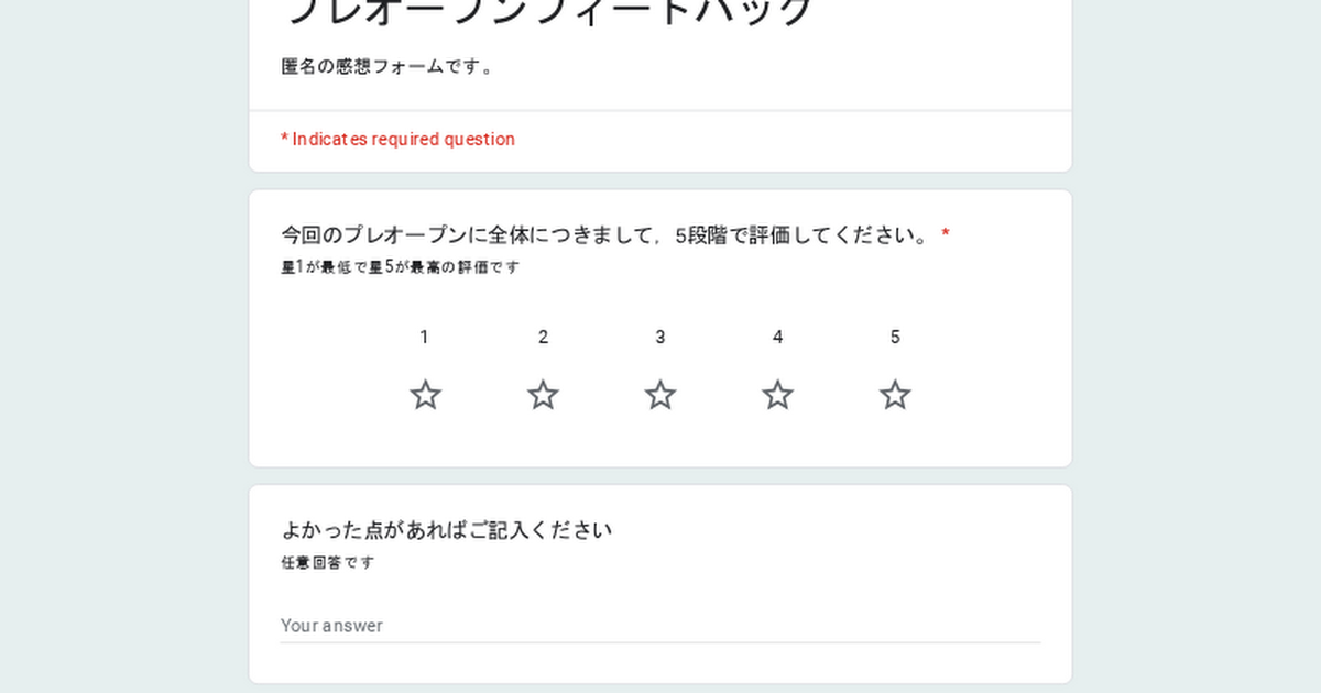 おしらせ プレオープンへのご意見・ご感想を募集しています おしらせ 2025.03.242025.03.25 プレオープンにお越しいただいた方を対象に,ご意見やご感想を受け付けております。 以下のリンクよりお送りください。 プレオープンフィードバック匿名の感想フォームです。